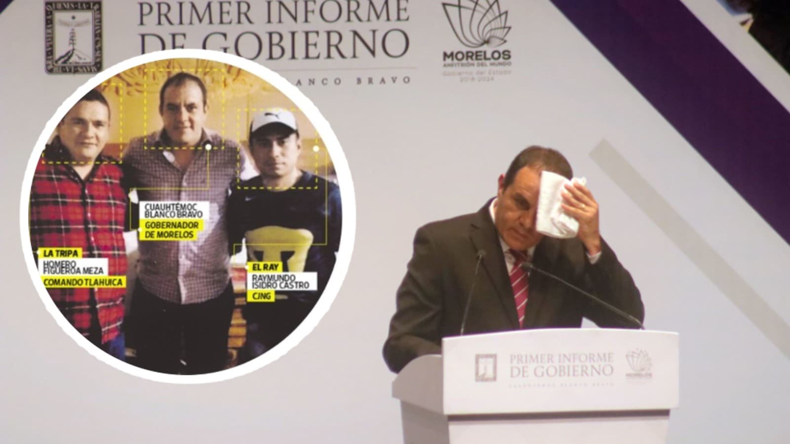Tras las declaraciones del gobernador deslindándose de conocer a los tres líderes del narco, respondió una organización criminal por medio de ‘narcomantas’, en donde lo acusan de sí conocerlos; amenazaron de que si continúa negando y “traicionando” los acuerdos revelaran datos precisos del asesinato del activista Samir Flores, quien luchó por la instalación de una termoeléctrica en Morelos.